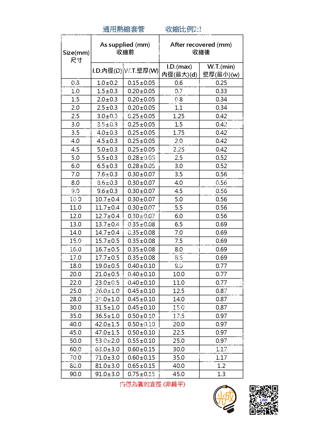 3. 操作溫度 -55˚C~125˚C,最低收縮溫度 70˚C,完全收縮溫度 110˚C 以上