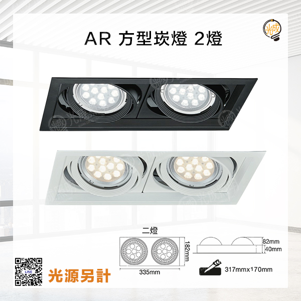 2燈 尺寸:長335 x 寬182 x 高40mm 崁入孔:長317 x 寬170mm 顏色:時尚白 / 貴族黑 適用光源:燈泡 LED AR111 x 2 (價格另計) 材質:鋁材外框、鐵材內框