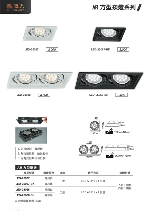 1. 四角方型設計,時尚潮流款式 2. 可裝9W或14W的AR燈泡 3. 方便安裝