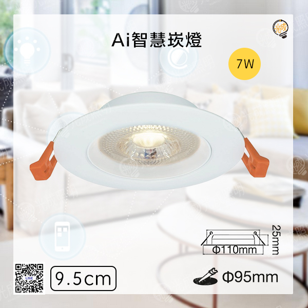 崁入孔 9.5公分 尺寸:直徑110 x 高25mm 瓦數:7W 色溫:黃光 3000K ~ 白光 6500K 光通量:100LM ~ 560LM 演色性:≧ 90 電壓:100V-240V (全電壓) 發光角度:36° 材質:PC罩、散熱塑