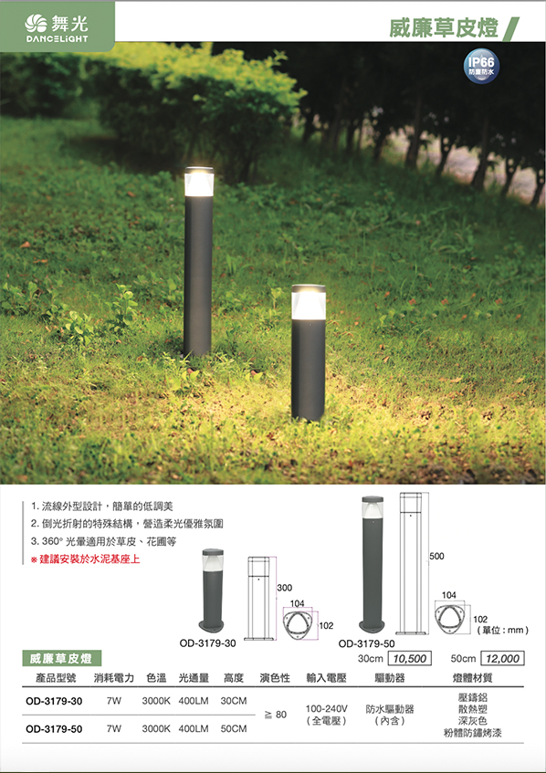 1. 流線外型設計,簡單的低調美 2. 倒光折射的特殊結構,營造柔光優雅氛圍 3. 360°光暈適用草皮、花圃等 ※ 建議安裝於水泥基座上