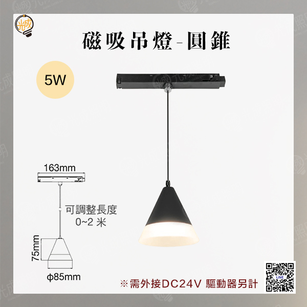圓錐 尺寸:直徑85 x 高75mm 線長:2000mm 瓦數:5W 色溫:黃光 3000K / 自然光 4000K 光通量:350LM / 400LM