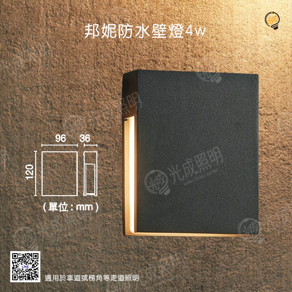 尺寸:長96 x 深36 x 高120mm 瓦數:4W 色溫:黃光 3000K 顏色:時尚白 / 貴族黑 光通量:220LM 演色性:≧ 80 電壓:100V-240V (全電壓) 驅動器:防水驅動器 (內含) 發光角度:190° 材質:壓鑄鋁、PC白色烤漆 / PC深灰色烤漆 適用地點:餐廳、陽台、客廳、臥室、走廊、樓梯、廚房、商業空間等照明環境皆適用
