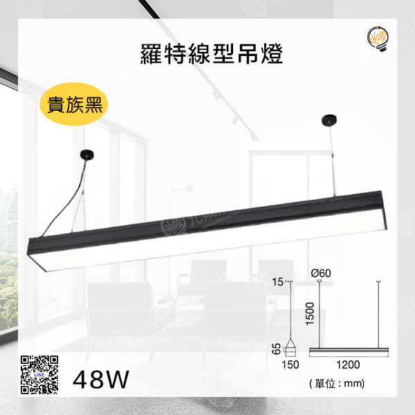 尺寸:長1200 x 寬150 x 高65mm 線長:1500mm 瓦數:48W 色溫:自然光 4000K 光通量:4800LM 顏色:貴族黑 / 時尚白 演色性:≧ 80 電壓:100V-240V (全電壓) 光束角:160° 材質:彩鋼板、PS罩