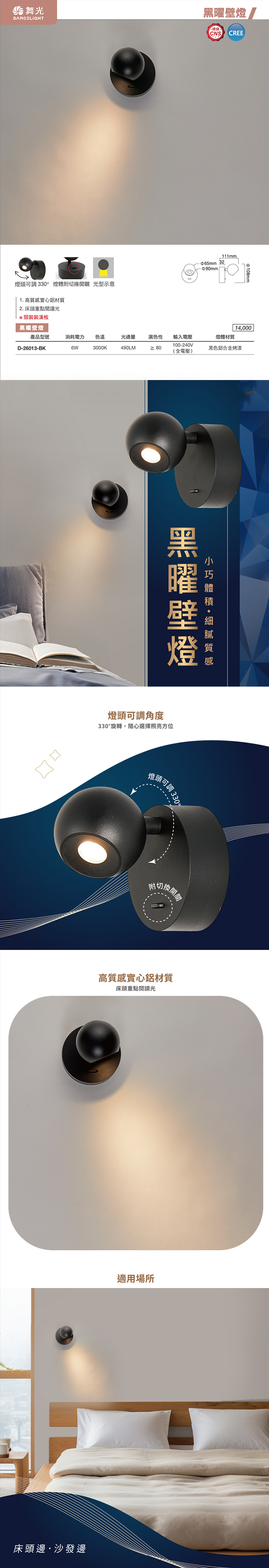 黑曜壁燈採用實心鋁材質 呈現出細膩的高質感 小巧的燈頭可自由轉向 安靜陪伴你的床頭閱讀時光
