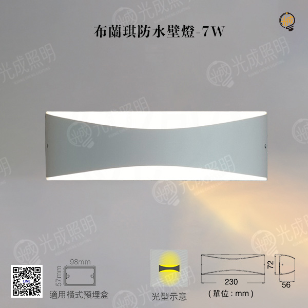 尺寸:長230 x 深56 x 高72mm 瓦數:7W 色溫:黃光 3000K 光通量:345LM 演色性:≧ 80 電壓:100V-240V (全電壓) 驅動器:防水驅動器 (內含) 發光角度:200° 材質:壓鑄鋁、散熱塑、白色粉體防鏽烤漆 適用地點:餐廳、陽台、客廳、臥室、走廊、樓梯、廚房、商業空間等照明環境皆適用
