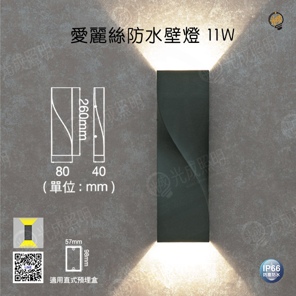 尺寸:長80 x 深40 x 高260mm 瓦數:11W 色溫:黃光 3000K 光通量:560LM 演色性:≧ 80 電壓:100V-240V (全電壓) 驅動器:防水驅動器 (內含) 光束角:140° 材質:壓鑄鋁、鋼化玻璃、深灰色粉體防鏽烤漆 適用地點:餐廳、陽台、客廳、臥室、走廊、樓梯、廚房、商業空間等照明環境皆適用
