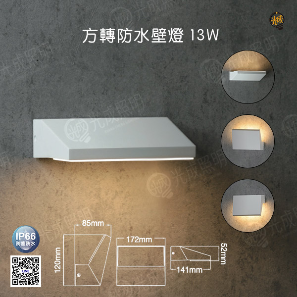 尺寸:長172 x 深141 x 高52mm 瓦數:13W 色溫:黃光 3000K 光通量:715LM 演色性:≧ 80 電壓:100V-240V (全電壓) 驅動器:防水驅動器 (內含) 發光角度:130° 材質:壓鑄鋁、散熱塑、白色粉體防鏽烤漆 適用地點:餐廳、陽台、客廳、臥室、走廊、樓梯、廚房、商業空間等照明環境皆適用
