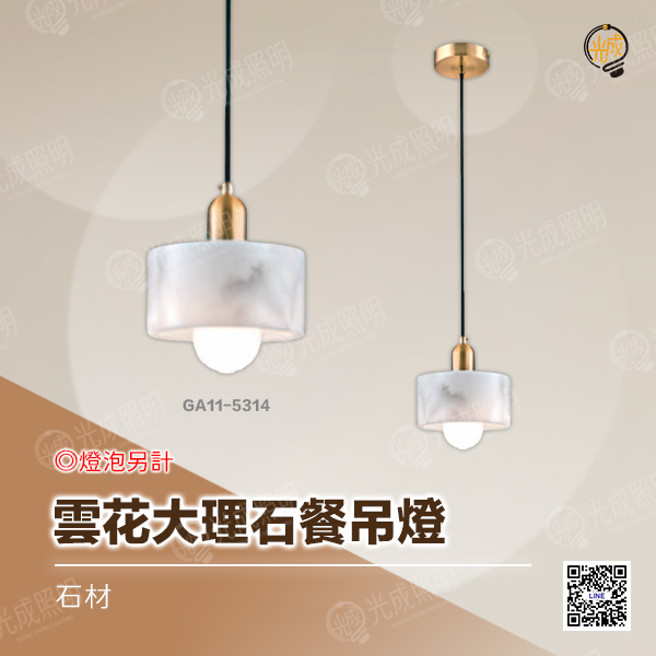 GA11-5314 尺寸:寬150 x 高150mm 線長:1000mm 光源:燈泡 E27 16W x 1 (價格另計) 材質:石材 (大理石條紋屬天然紋理)