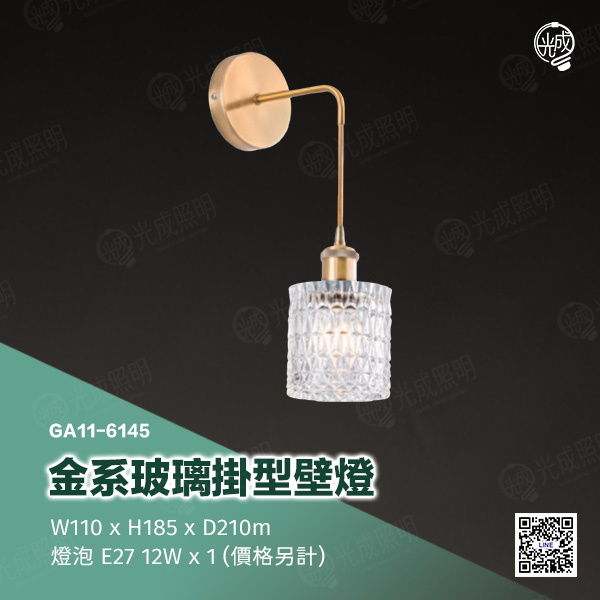 GA11-6145 尺寸:寬110 x 高185 x 深210mm 光源:燈泡 E27 12W x 1 (價格另計) 材質:鐵材電鍍金古銅、玻璃 備註:線長可調動
