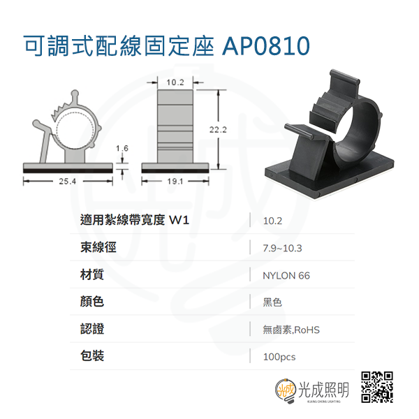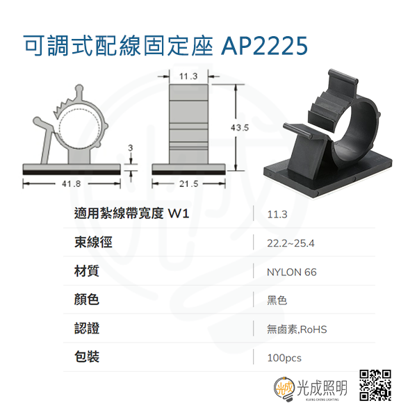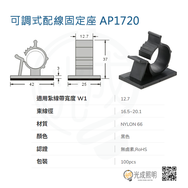 材質:UL合格之NYLON 66(黑色),防火等級94V-2,底座背膠。 用法:使用時將離型紙撕去,固定於基板之上,再將電線扣上即可。 特點: 1.一種規格的AP型可調式固定座,即可適合多種規格的電線使用,大量降低庫存壓力。 2.裝配簡單、快速、牢固,開啟容易,可多次重複使用。