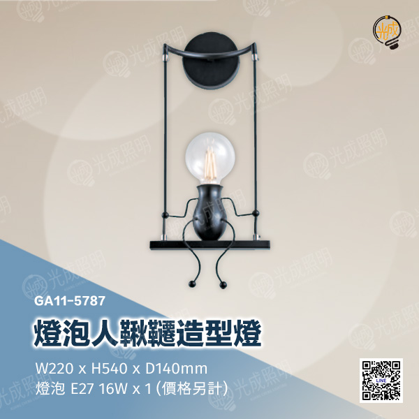 GA11-5787 尺寸:寬220 x 高540 x 深140mm 光源:燈泡 E27 16W x 1 (價格另計) 材質:鋼材烤黑漆
