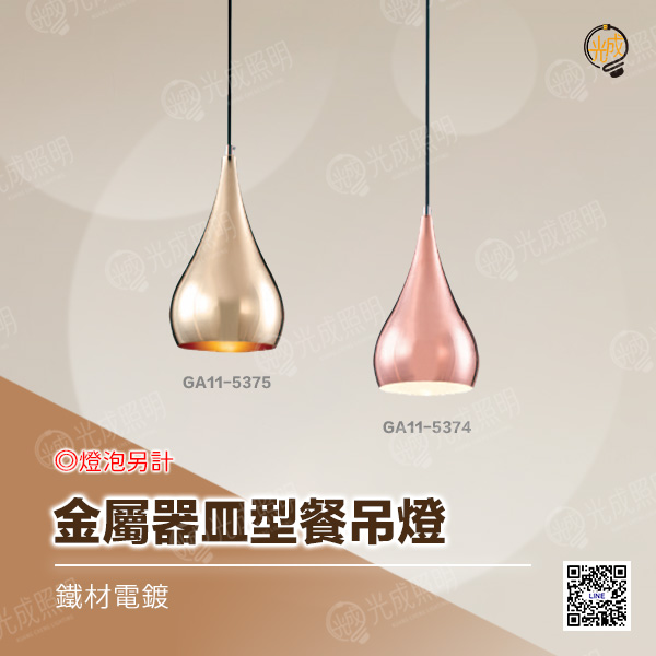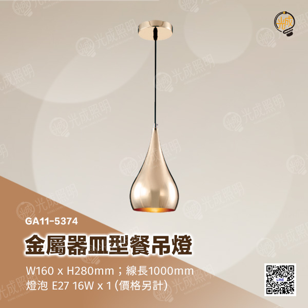 GA11-5375 尺寸:寬160 x 高280mm 線長:1000mm 光源:燈泡 E27 16W x 1 (價格另計) 材質:鐵材電鍍金色